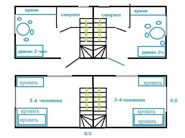 Рассчитан на две отдельных семьи из 6-ти человек.Дополнительно есть детские кровати. Имеет индивидуальне беседки.